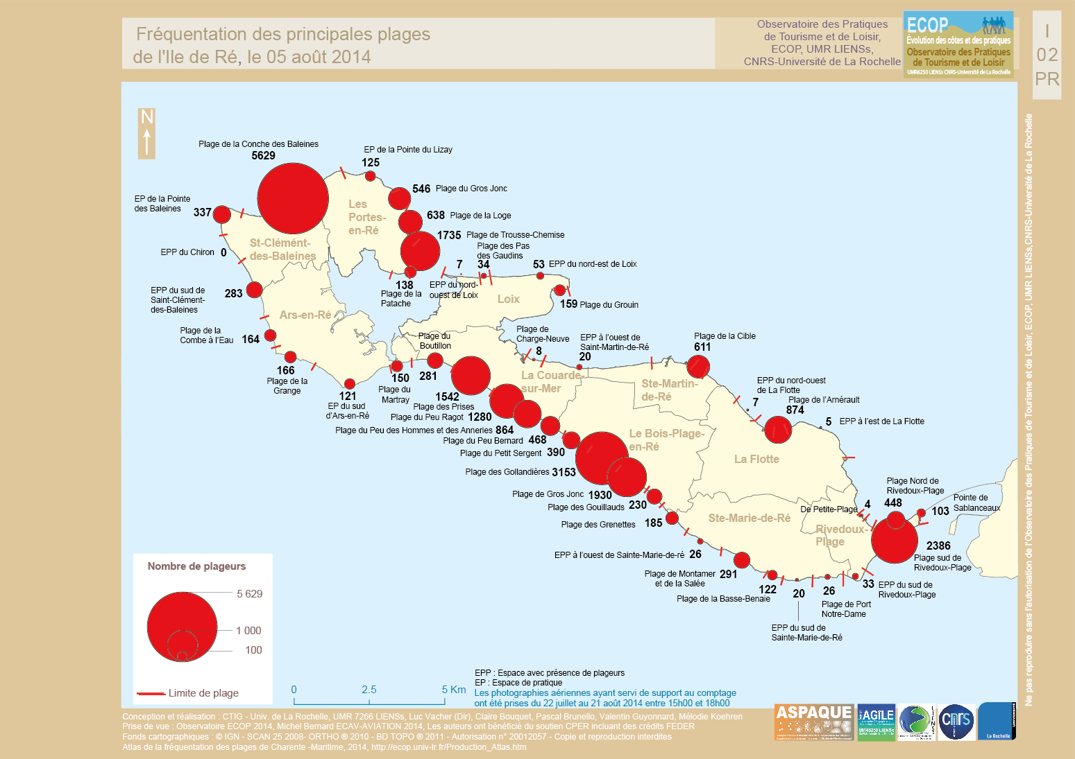 Source : Vacher Luc, (dir), Bouquet Claire, Brunello Pascal, Guyonnard Valentin, Koerhen Mélodie, 2015, Atlas de la fréquentation des plages de Charente-Maritime, Campagne 2014, CTIG La Rochelle Université FLASH, Observatoire des Pratiques de Tourisme et de Loisir-ECOP de l’UMR 7266 LIENSs CNRS - Université de La Rochelle, 329 p. [en ligne] http://ecop.univ-lr.fr/Production_Atlas.htm |